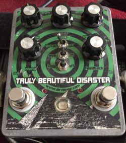 Now that I told you everything I can (with a level of confidence) about fuzz, I want to start looking at specific ones. Before I found my current fuzz pedal, the Truly Beautiful Disaster, I knew exactly the sound I wanted to create – a table saw devouring its prey, a razor blade scratching across a blackboard, the sweetest, most painful cut-through that I could find. The very thought of it gave me a maniacal smile and I dreamt of applying it to every damn song I would ever write! Of course, that was just excitement, not blind ignorance. But I went on a search and it didn’t matter where in the world I would find it. The beauty of the internet is that you have the possibility to find anything, in any country, anywhere. The only problem is to actually get it in your hands sometimes takes a lot of effort, time and money. (refer to my first blog post as to why we started Feedback Pedals) I looked a lot at the most easily found boutique pedal shops in Europe (as there was absolutely none near Prague) and found at least a few Death By Audio pedals that were interesting. The Fuzz War is known around the world as one of the best fuzzes out there, but I was looking for something much more tweakable, with more features. I discovered the Edge used the Supersonic Fuzz Gun and checked DBA out finding that loads of top musicians have a DBA pedal on their board. I compared this pedal endlessly to find out as much as possible about this and many other pedals (the likes of Red Witch, Z-Vex, Dwarfcraft Devices, Earthquaker Devices, Electroharmonix – all quality boutique level pedal makers). But I started searching further and, as mentioned already in my first post, contacted Devi Ever, waited too long (not her fault at all) and finally got by TBD, which is a pedal that makes my bandmates shake their head laughing even 4 years on. Its self-oscillation dial helps out whenever we need to simulate the sound of a helicopter on stage before our cover of Morning Glory!